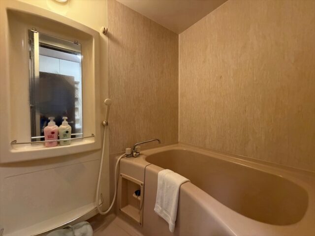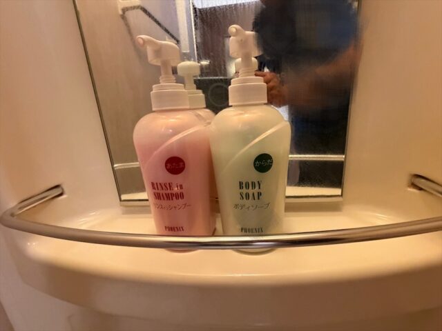 部屋のバスルームはかなり古いデザインっぽいユニットタイプで狭いですが浴槽と洗い場が別個のものです。おそらく1210サイズではないかと思います。地下1階に温泉があり、本館の温泉も使えますので大きいお風呂に入りたいときはそちらが使えるので部屋のお風呂を使う機会は限られるかもしれません。部屋のお風呂のアメニティはフェニックスのボディーソープとリンスインシャンプーです。リンスは別に用意されていません。ちなみに大浴場にはリンスとシャンプーはそれぞれ別に用意されていました。
