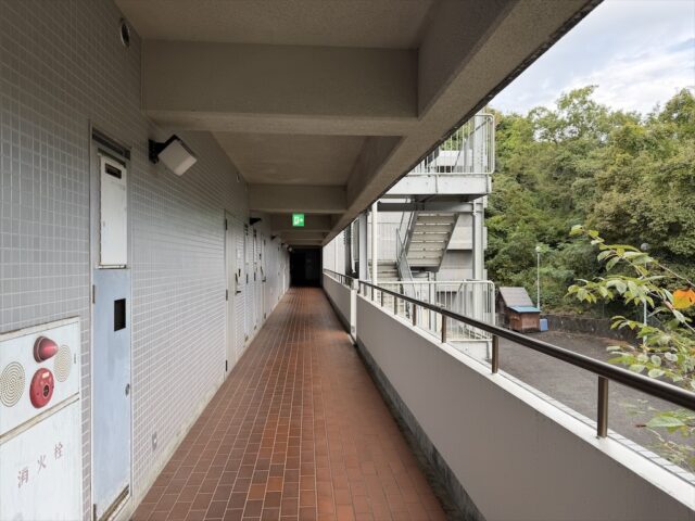 客室フロアは外廊下構造で、通気性はいいものの夜はやや寂しい雰囲気。