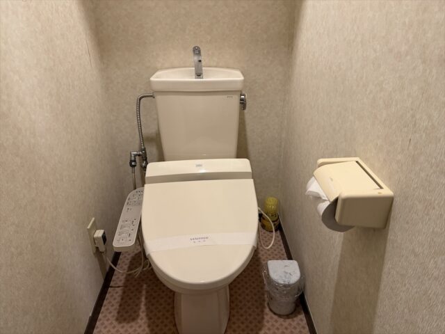 部屋のトイレもちょっと時代を感じるウォッシュレットですがこちらもきれいに使われています。個人的に洗浄済の帯があるところに好感を感じました。最近はこういうのなかなか見ないですよね。