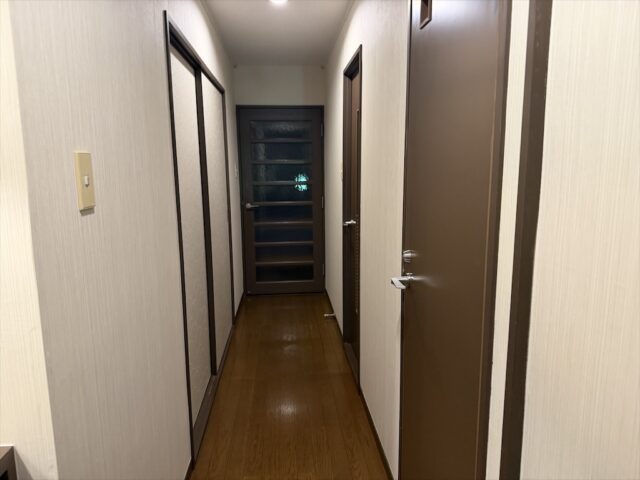 今回宿泊したのは小型キッチン付きの和洋室です。玄関で靴を脱いで上がり、正面に廊下が。左側の扉が和室、正面の扉が洋室(キッチン・リビング・ツインベッド)、右奥のドアがバスルーム。右手前のドアがトイレです。