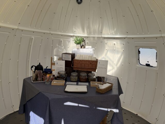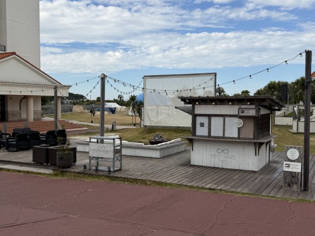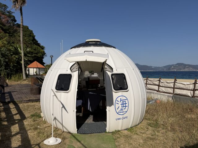 ビーチの横にある海の家の前に白い丸い建物がぽつんと現れます。ここが「海カフェ」。i+Land nagasakiの無料カフェ巡りの中でも海が近くて雰囲気のいい場所かもしれません。